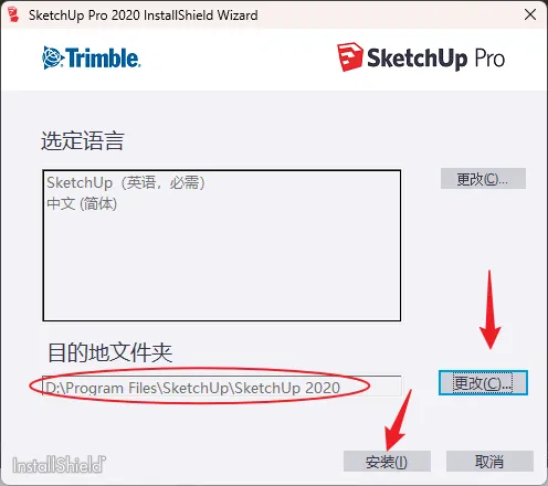 4.点击【更改】更改软件安装路径,建议安装到除C盘之外的其它磁盘内,可以新建目标文件夹【D:\Program Files\SketchUp\SketchUp 2020】,然后点击【安装】。