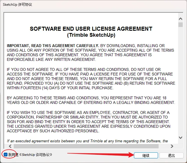 13.勾选【我同意《SketchUp》许可协议】,然后点击【继续】。