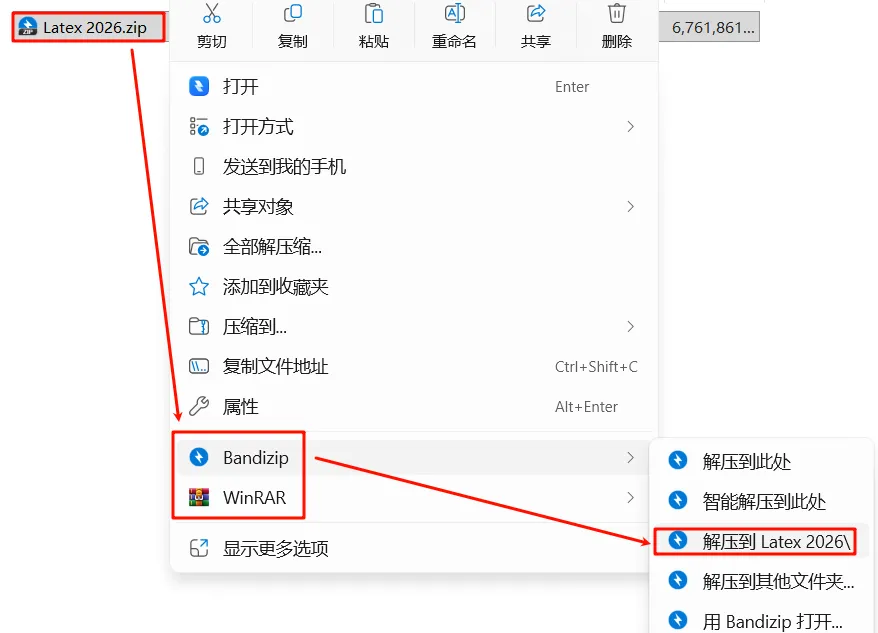 1.选中下载的安装包,右键选择解压到"LaTex 2026"文件夹