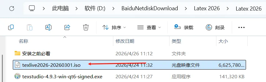 2.双击打开“texlive2026-20260301.iso”文件(如果打不开,”鼠标右键选择“打开方式—Windows资源管理器”打开)