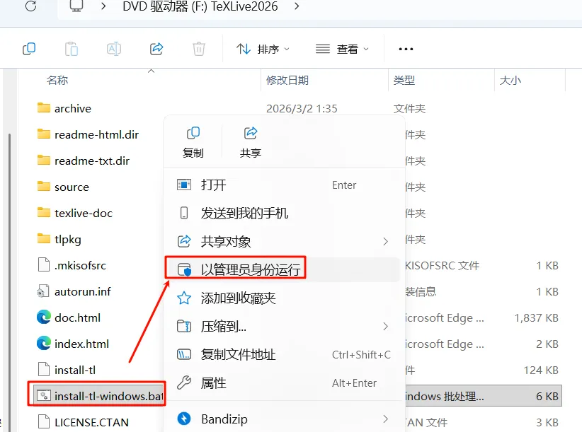 3.找到并选中“install-tl-windows.bat”鼠标右键选择以管理员身份运行