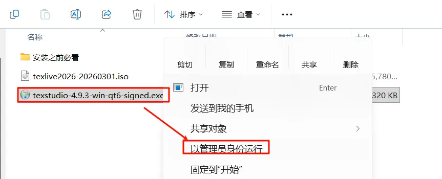 7.选中“texstudio-4.9.3-win-qt6.exe”右键以管理员身份运行