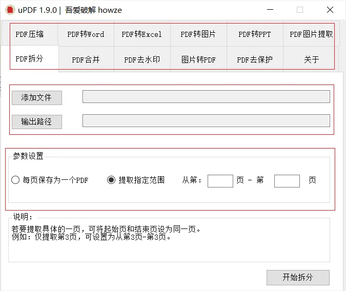 添加文件后,可选择“每页保存为一个 PDF”或“指定范围页面”;若需提取单页,将起始页与结束页设为同一数字即可。