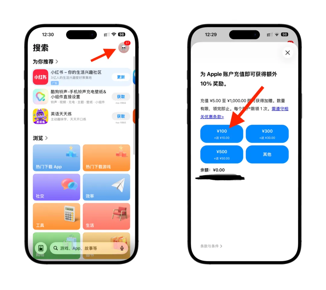 需要充值的用户打开「App Store」后,点击右上角头像进入账户,选择为 「Apple 账户充值」选金额即可自动到账 + 赠金。