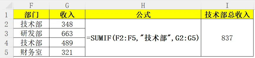 =SUMIF(F2:F5,"技术部",G2:G5)