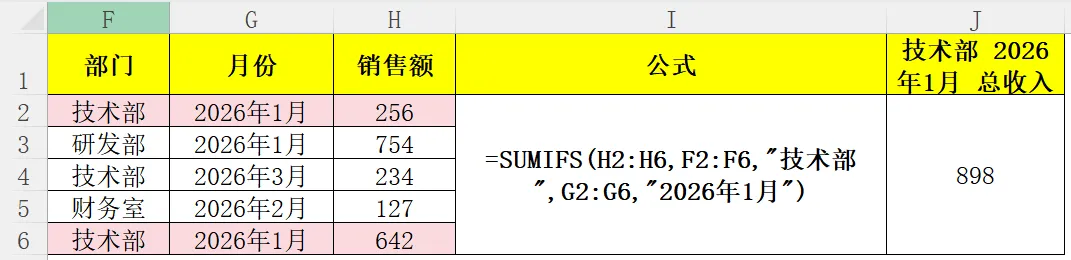 =SUMIFS(H2:H6,F2:F6,"技术部",G2:G6,"2026年1月")