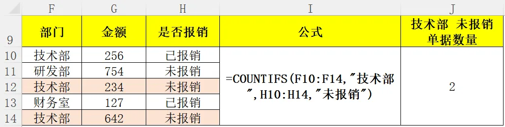 =COUNTIFS(F10:F14,"技术部",H10:H14,"未报销")