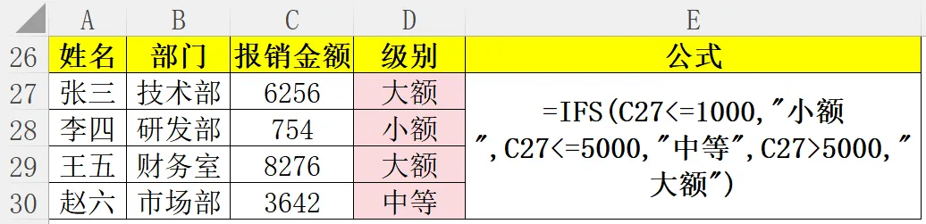 =IFS(C27<=1000,"小额",C27<=5000,"中等",C27>5000,"大额")
