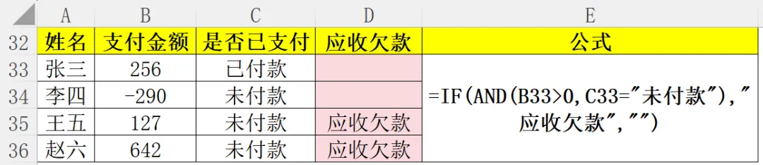 =IF(AND(B33>0,C33="未付款"),"应收欠款","")