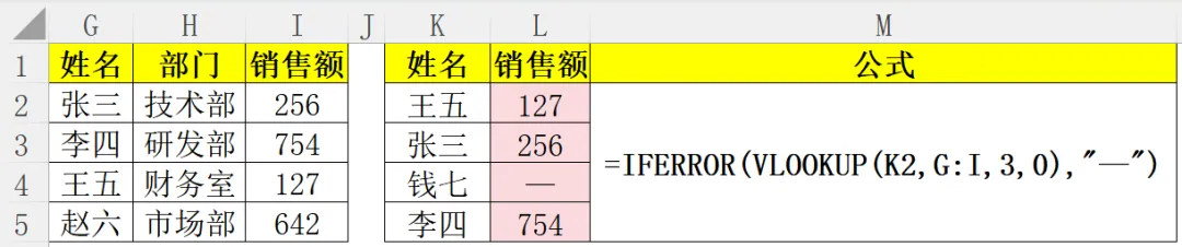 =IFERROR(VLOOKUP(K2,G:I,3,0),"—")