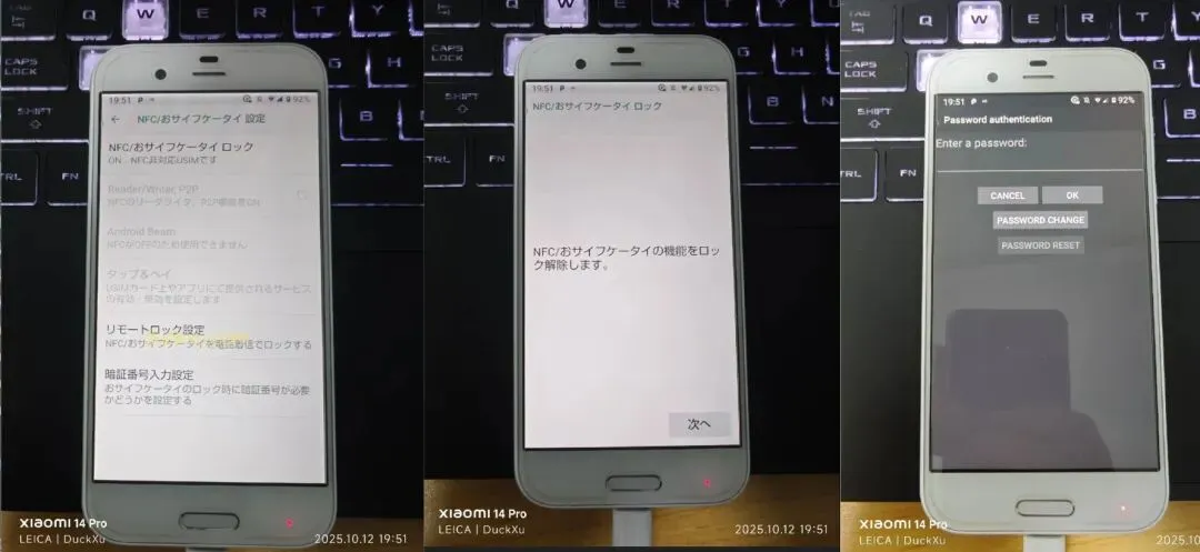 如图,提示“NFC/手机钱包锁打开,不支持NFC的USIM”、“解锁NFC/手机钱包锁”。