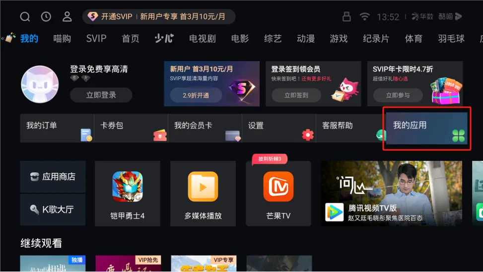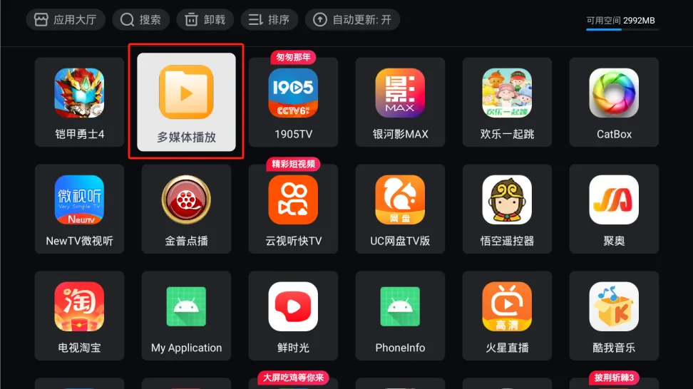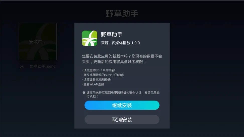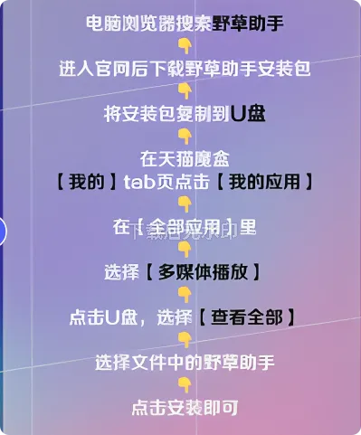 电脑浏览器搜索野草助手,进入官网后下载野草助手安装包,将安装包复制到U盘,在天猫魔盒【我的】tab页中点击【我的应用】,在全部应用里选择【多媒体播放】,点击U盘,选择【查看全部】,选择文件中的野草助手安装包,点击安装即可。