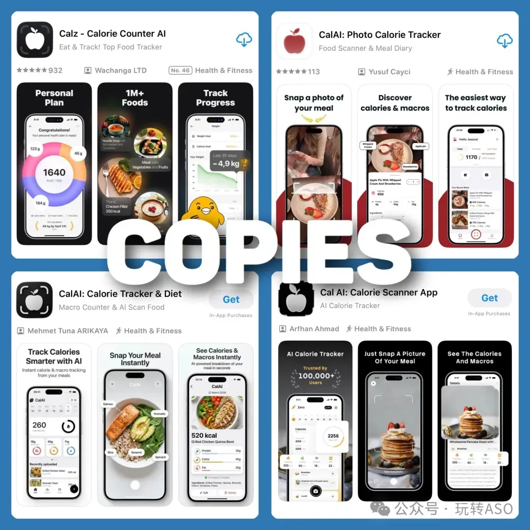 其他的模仿者试图通过在标题里强蹭 Cal AI 来获取流量,这种直白的侵权行为是苹果审核员最容易捕捉的目标。如果你在标题中直接使用了竞争对手的