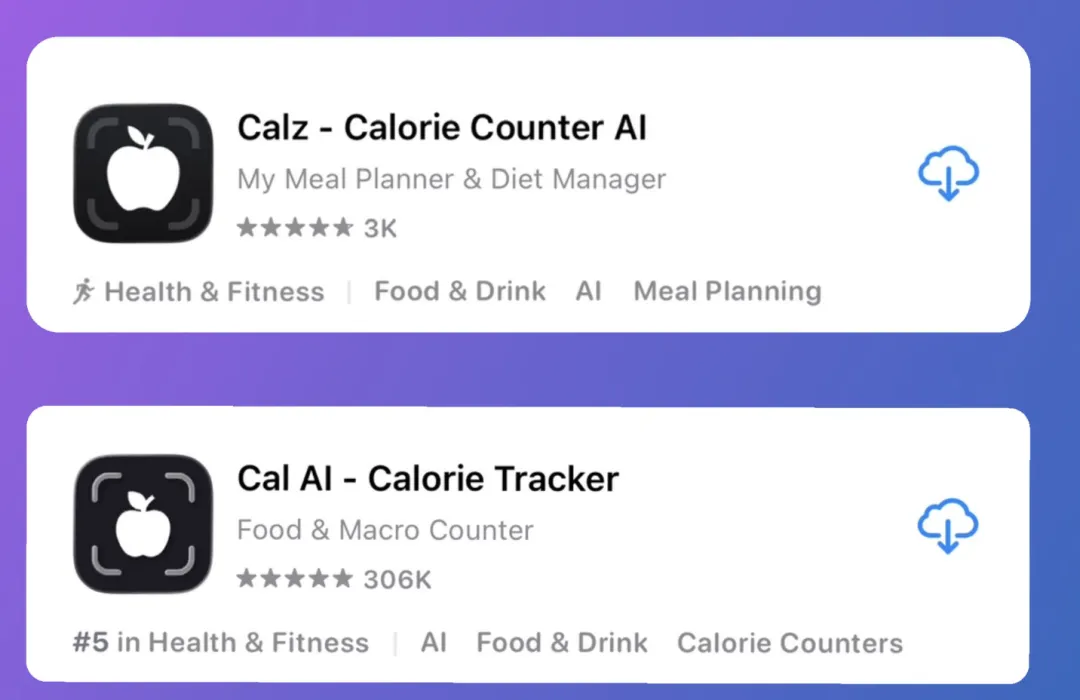尽管名字避开了雷区,如果你仔细观察 Calz 的图标,会发现它几乎厚颜无耻地复刻了 Cal AI 的视觉语言。甚至 Calz 的创始人自己也承认,这确实是在模仿。