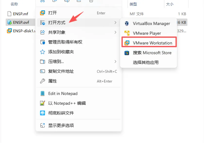 3) 右键打开ENSP.ovf(通过VMware打开)