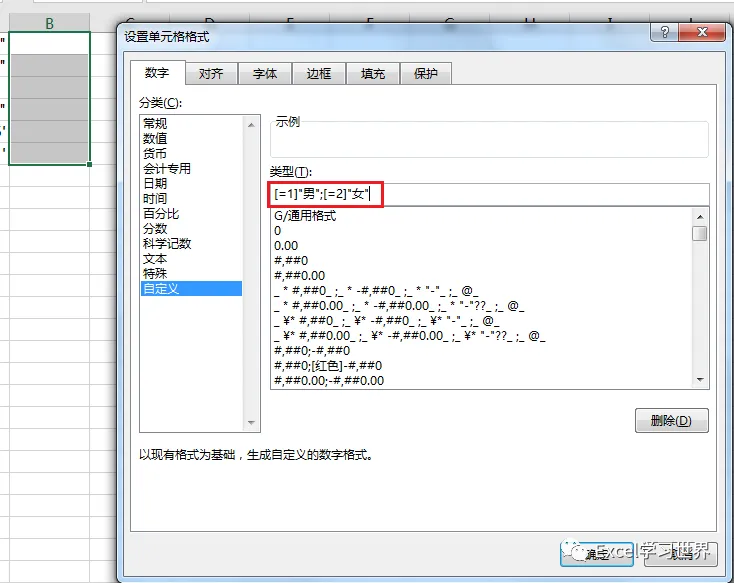设置以下类型,在单元格内输入 1 时自动显示“男”,输入 2 则自动显示“女”: