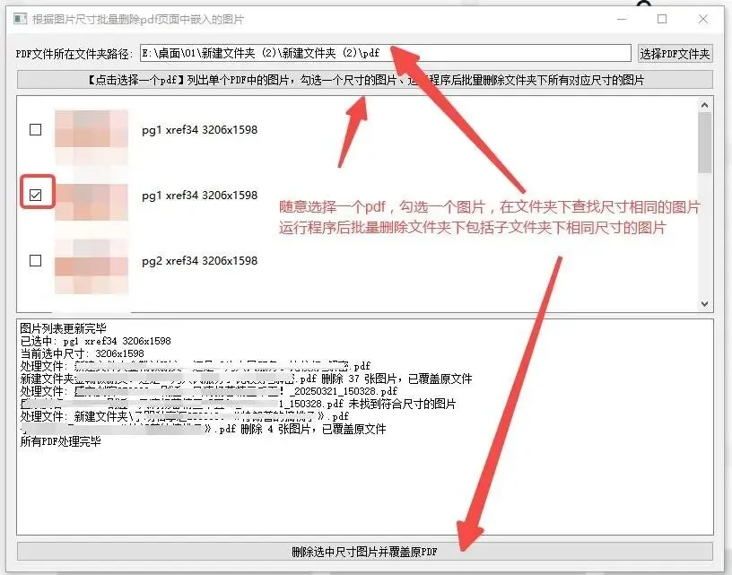 批量查找指定文件夹下pdf页面中指定尺寸的图片并删除该尺寸的所有图片,图片必须是独立的图片,可以是水印、也可以是其他类型图片,水印不能是图片上的水印(即图片文字水印),这种无法删除。