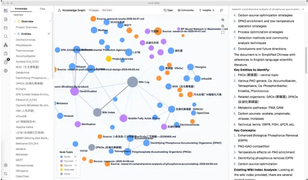 LLM Wiki 会顺手把知识图谱也建出来,页面之间的关系、缺口、重复内容,能看得更直一点。