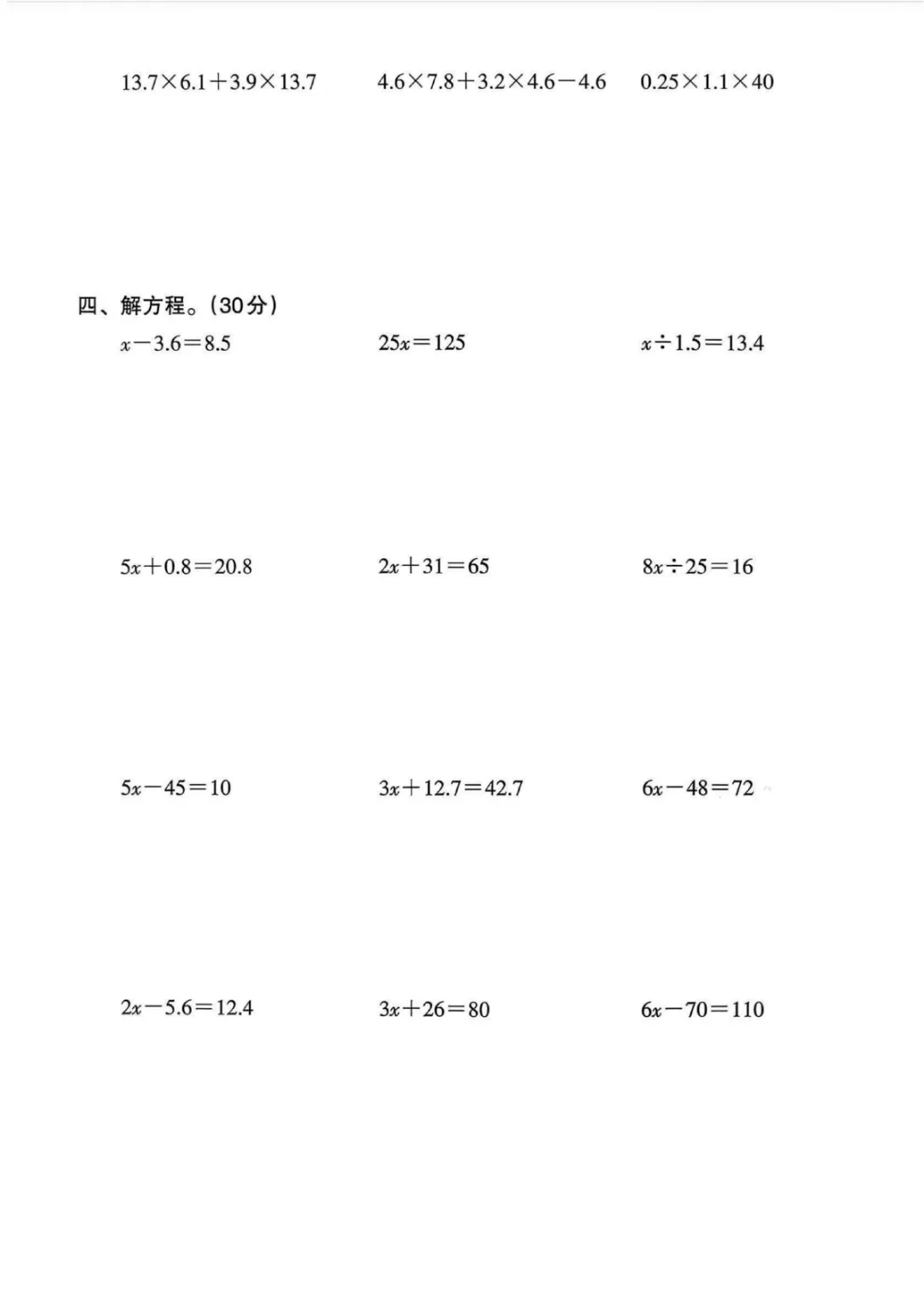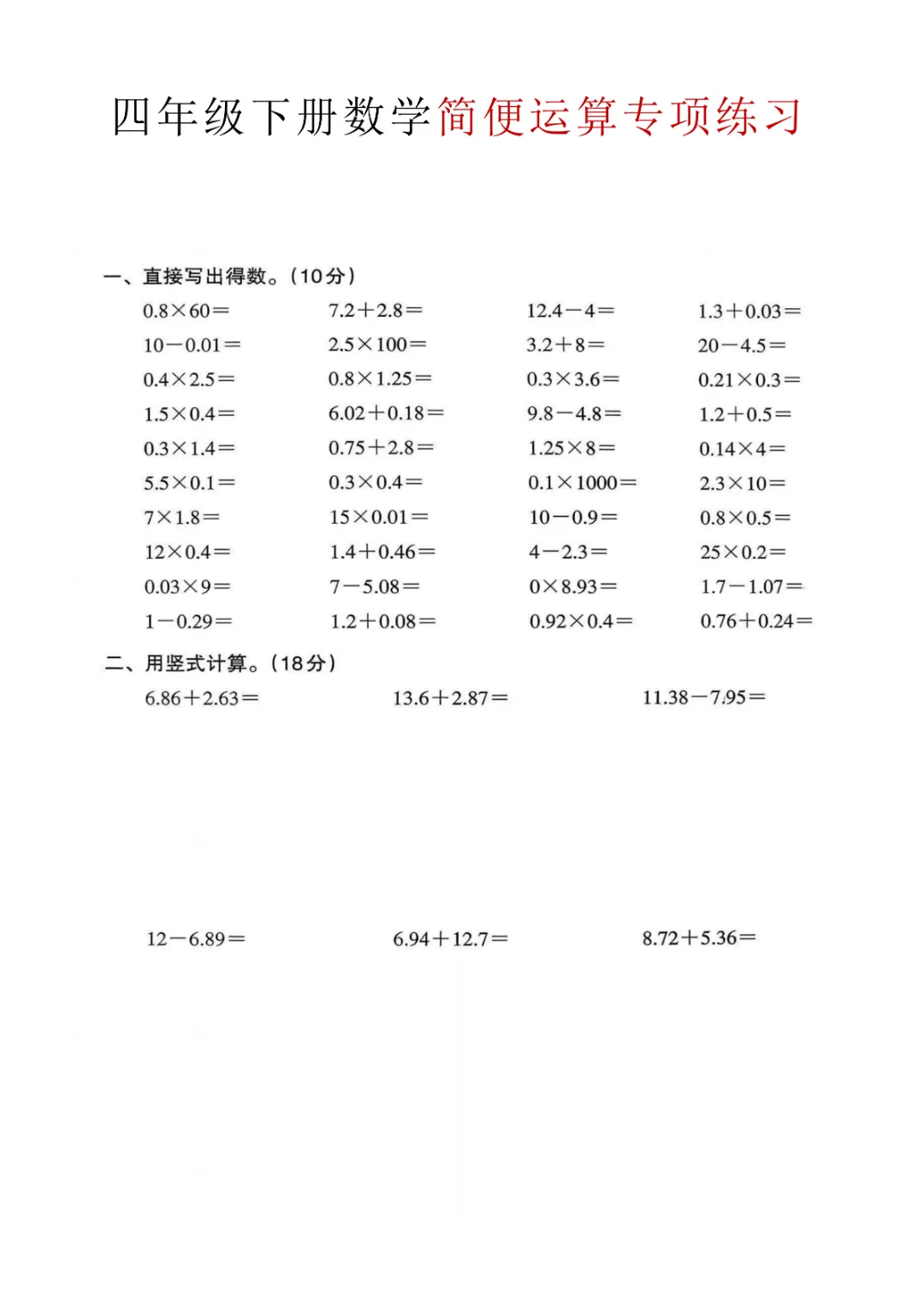 今天给大家分享的是:四年级下册数学【通用版】【简便运算专项练习带答案】丨完整高清电子版可打印