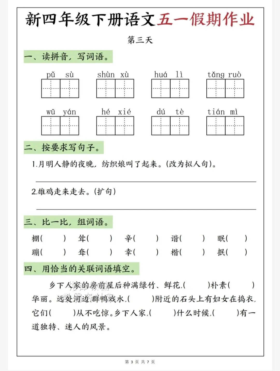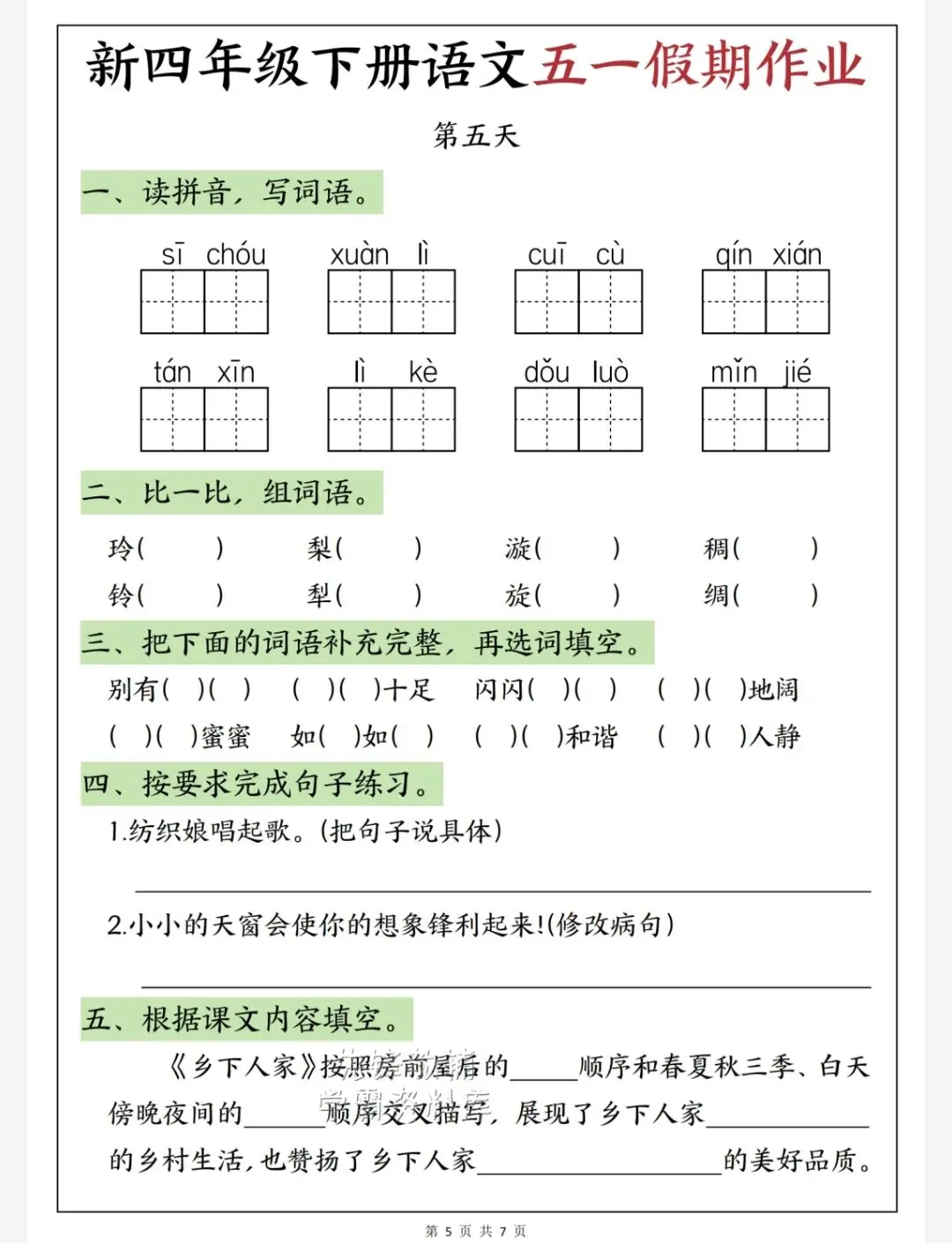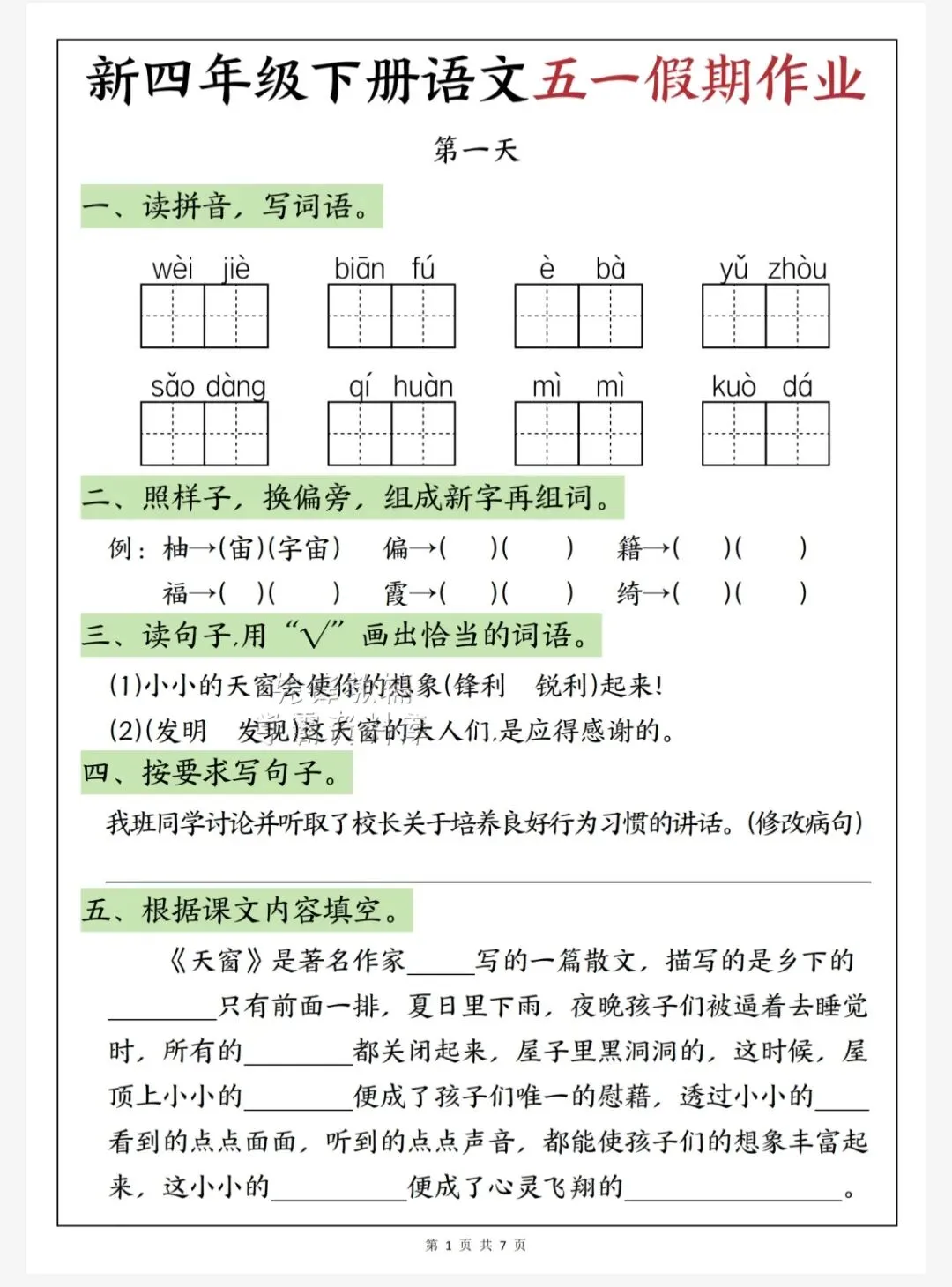 今天给大家整理了26春四年级下册语文五一假期作业,转发给朋友或班级群,受益更多人,帮助孩子学习!