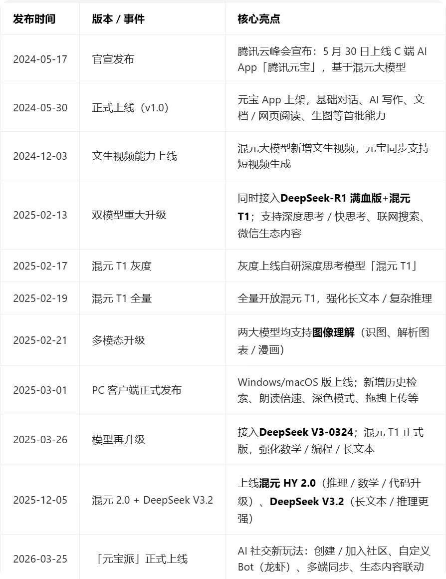 2024年5月30日,腾讯元宝正式上架各应用商店,支持AI搜索、总结、写作三大核心能力。6月新增多轮对话能力并支持50个文档批量解析;7月上线“深度搜索”模式和“3D角色梦工厂”;8月推出口语陪练和超能翻译官功能;9月品牌智能体专区上线。11月,2.0版本正式发布,实现了与腾讯文档生态的打通。