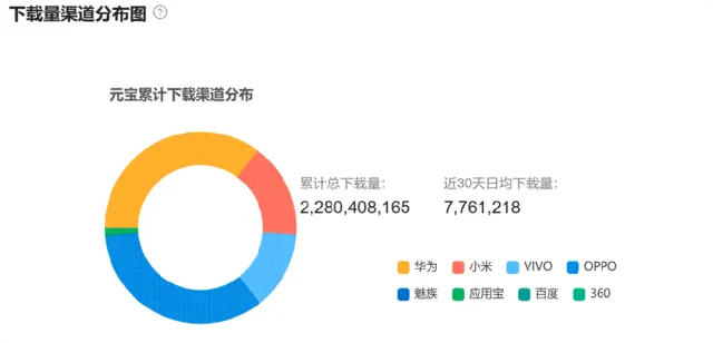 目前累计下载量22.8亿多,近30天日均下载量776万多,主要下载渠道是华为、OPPO应用,分别为35%和34%,这也说明大部分用户是华为和OPPO手机用户。
