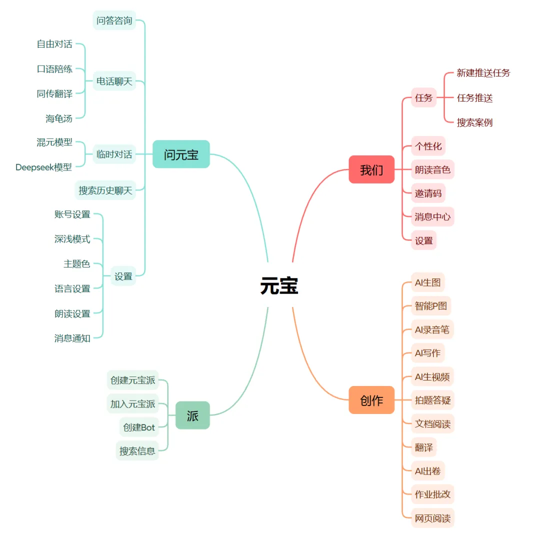 腾讯元宝功能主要包括四大模块,“问元宝”、“创作”、“派”、“我们”。其中“派”需要获得邀请码加入之后才能进行使用。具体功能框架如下图: