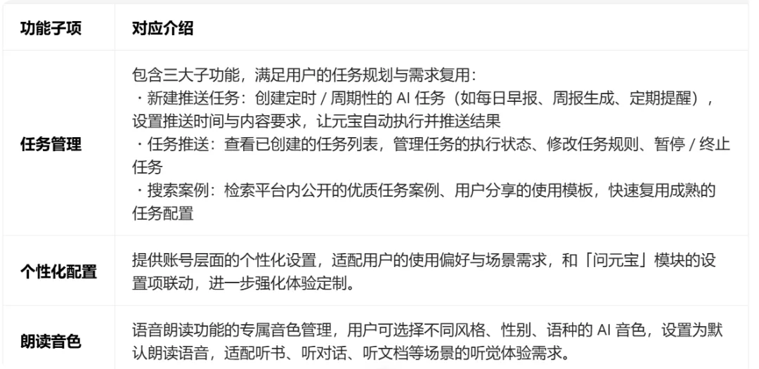 我们:腾讯元宝的个人管理后台,聚焦用户个性化体验、任务管理与账号服务,帮助用户高效管理使用过程中的各类事务。