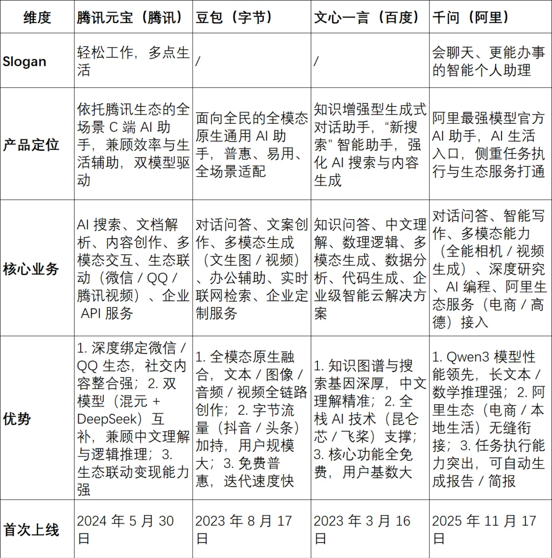 2026年2月,2.6版本推出“元宝派”社交功能,打通微信、QQ社交链路;4月优化社交功能稳定性与拟人化交互,推动产品从“工具型”向“伙伴型”转型,核心目标是提升用户留存,完善社交场景布局。