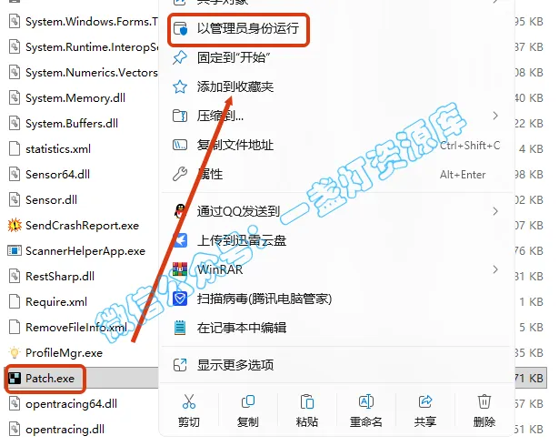 12.完成粘贴操作之后,再选中【Patch.exe】文件,鼠标右键选择【以管理员身份运行】