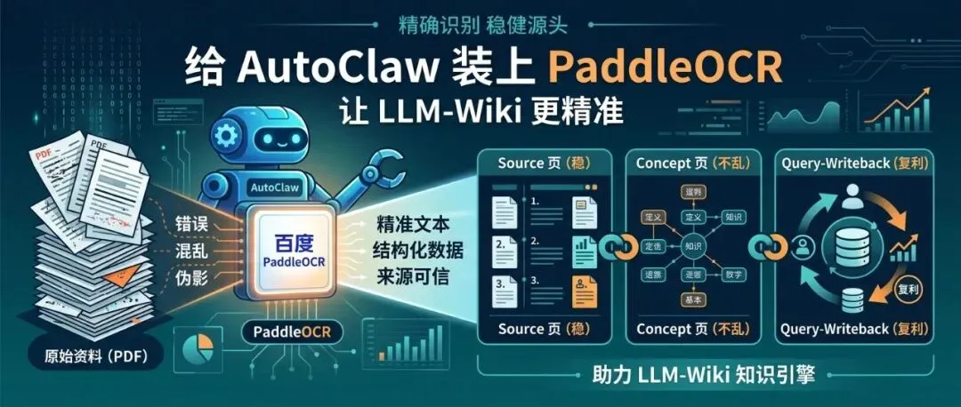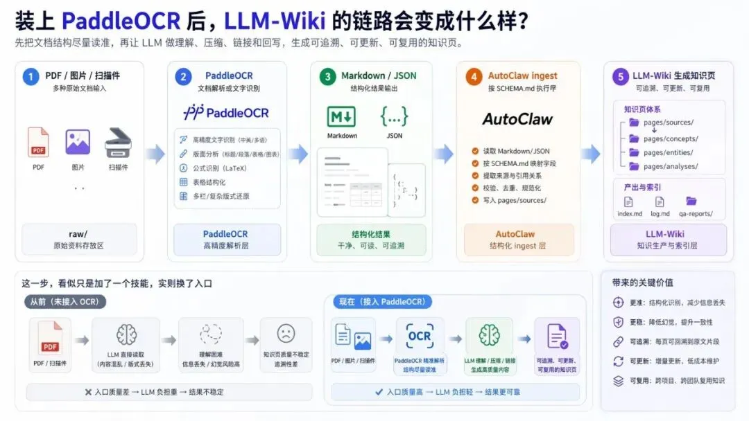 当 raw/ 里是 PDF、扫描件或图片时,中间要补一层高精度解析:先用 PaddleOCR 读准结构,再让 LLM 理解、压缩、链接和回写。