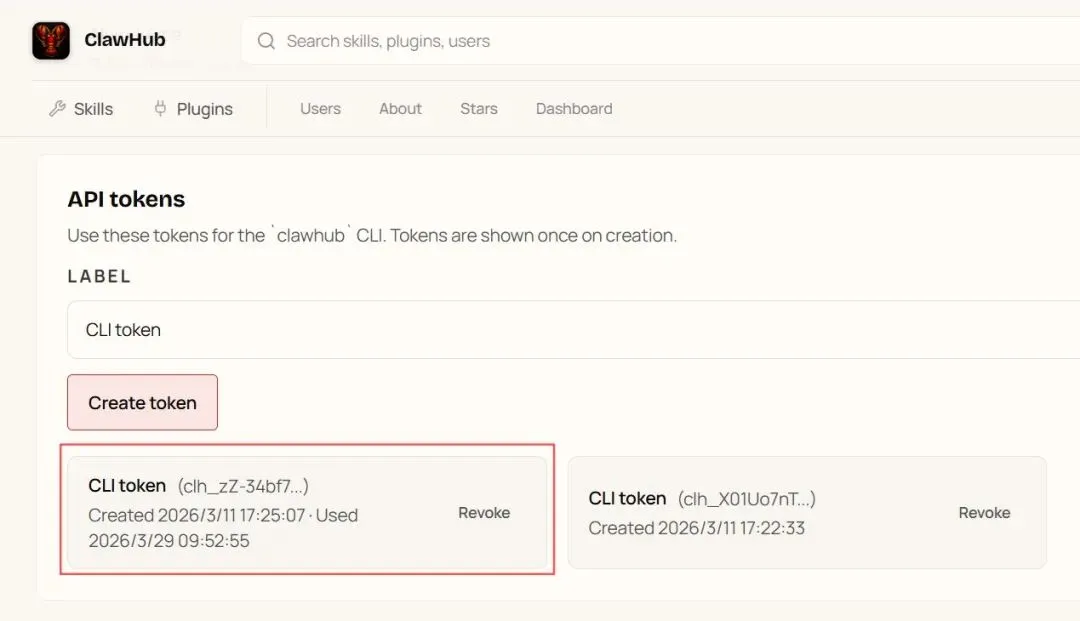 访问 https://clawhub.ai,登录后进入 Settings,创建 API tokens。它通常以 clh_ 开头。