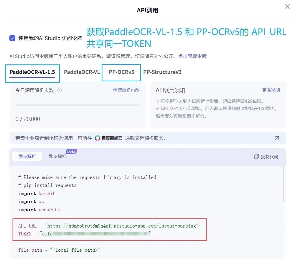 • PaddleOCR-VL-1.5 的 API_URL • PP-OCRv5 的 API_URL • PaddleOCR 官网 的 Access Token