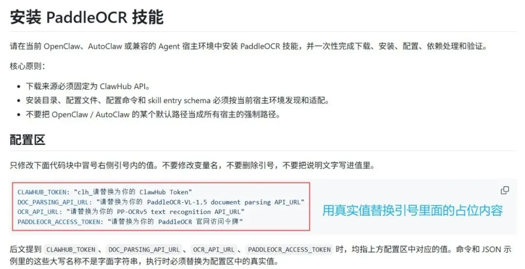 • PaddleOCR Agent Skills 文档:https://www.paddleocr.ai/latest/version3.x/deployment/skills.html • ClawHub Document Parsing:https://clawhub.ai/bobholamovic/paddleocr-doc-parsing • ClawHub Text Recognition:https://clawhub.ai/bobholamovic/paddleocr-text-recognition