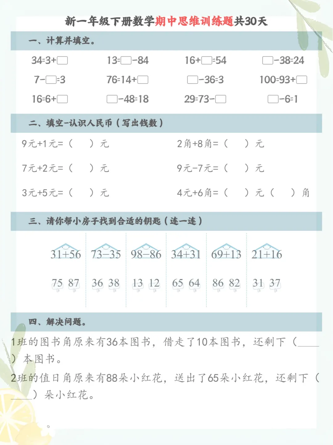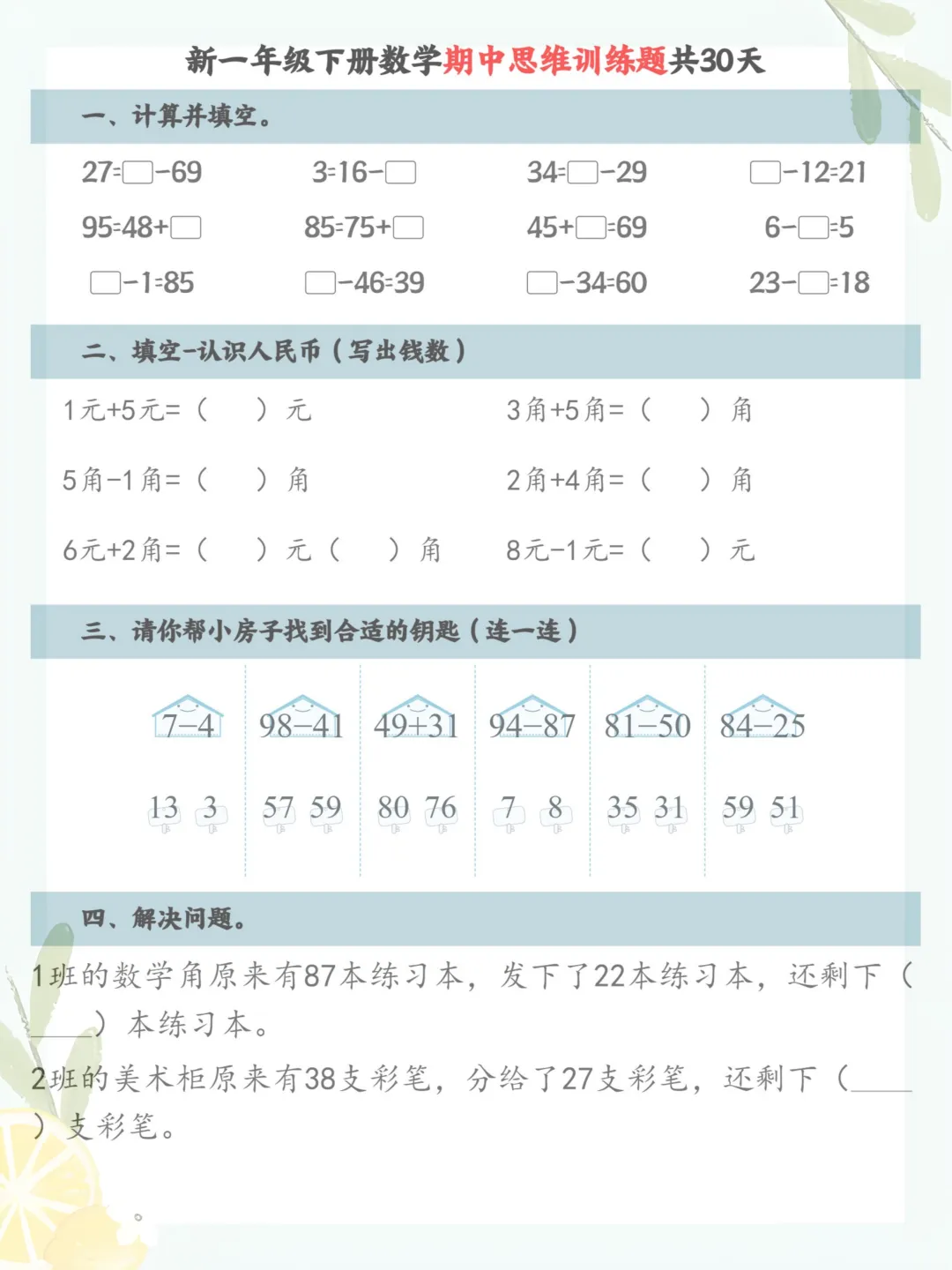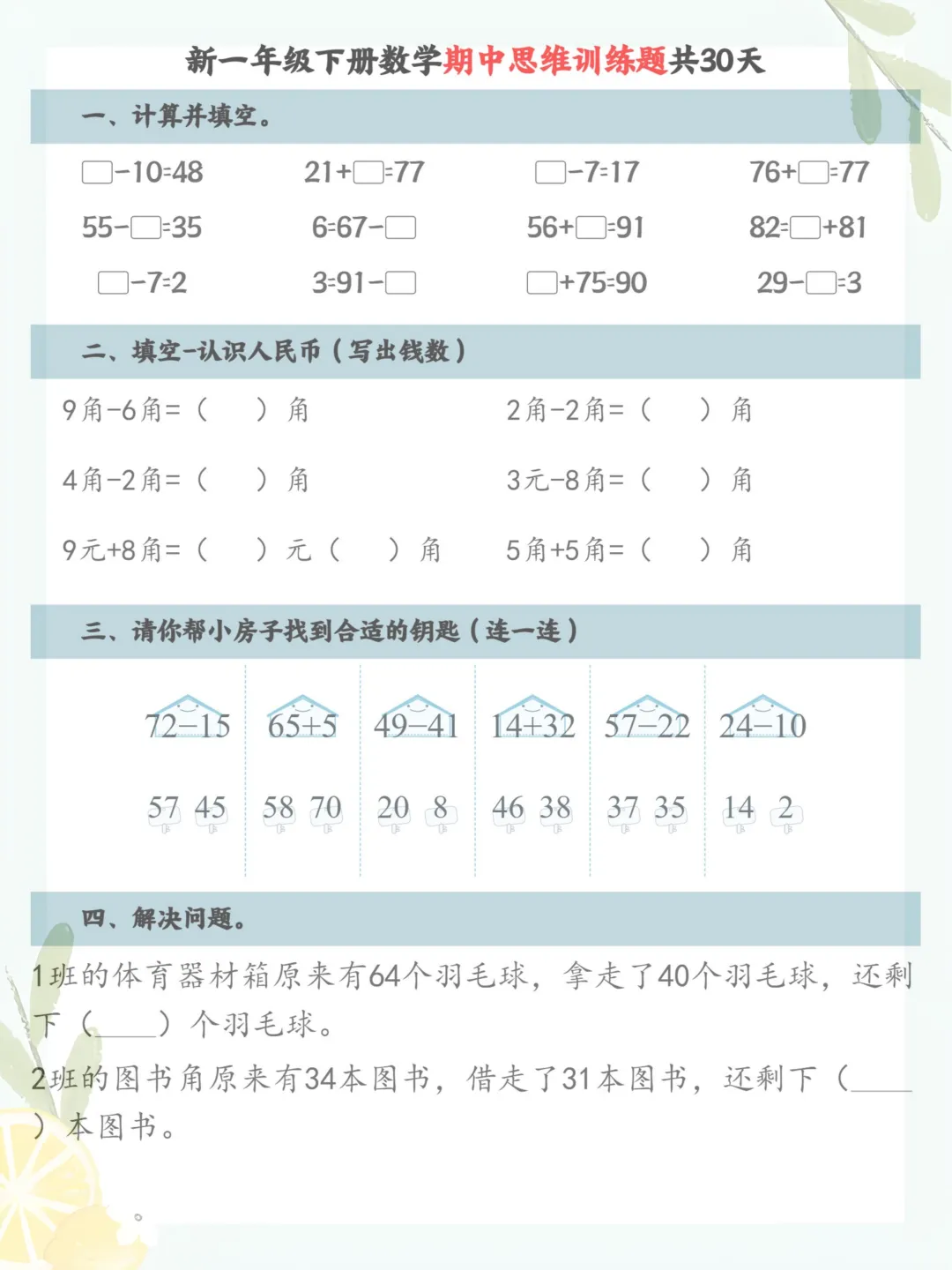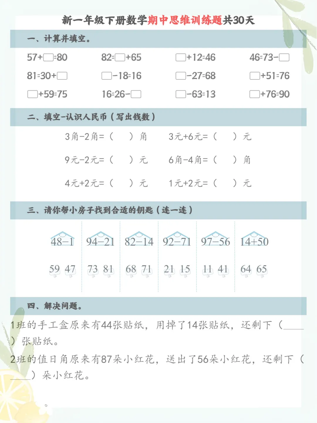 新一年级下册数学期中思维训练题共30天,共30页,电子版可下载可打印,这份资料围绕一年级下册数学期中阶段复习与思维训练设计,按天安排练习内容,涵盖多个核心知识点与专项训练内容,能够帮助孩子在巩固基础的同时加强审题、计算与数学思维能力,适合作为阶段性查漏补缺和考前练习使用。需要的家长可以及时下载打印出来,让孩子每天练一练,更扎实地掌握所学内容。
