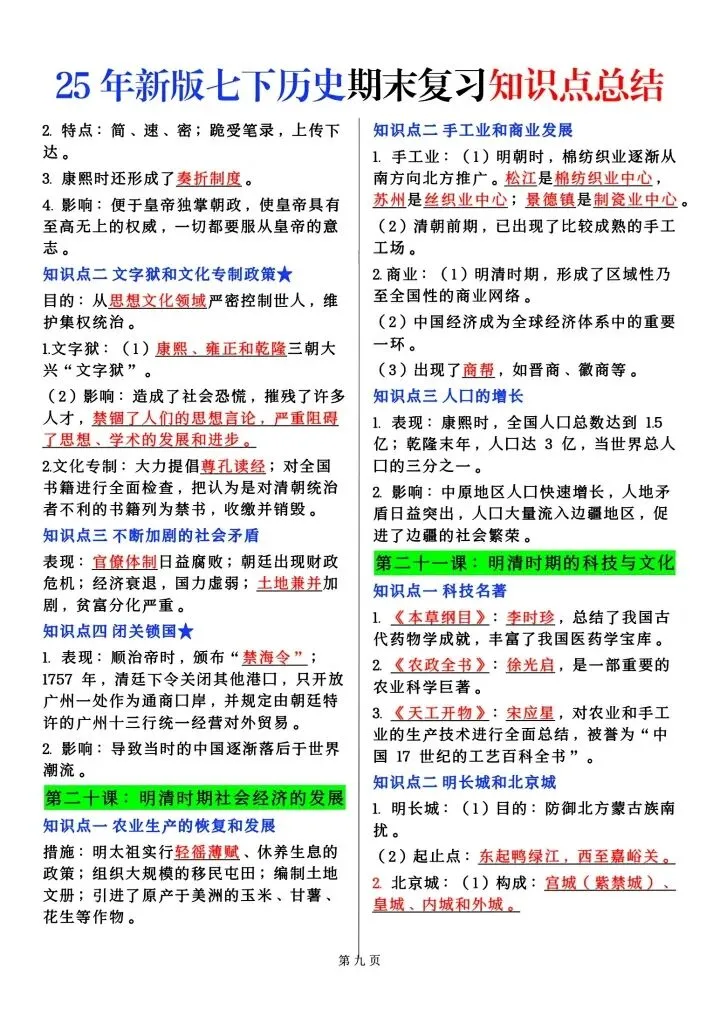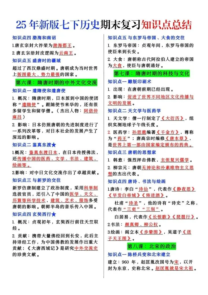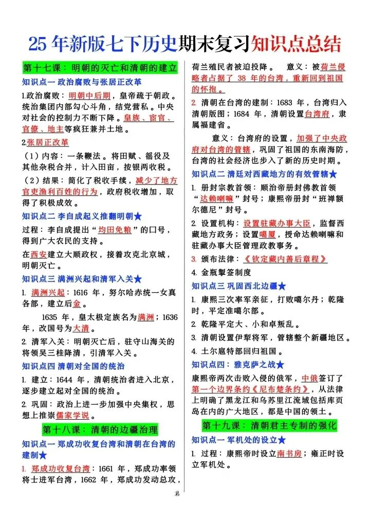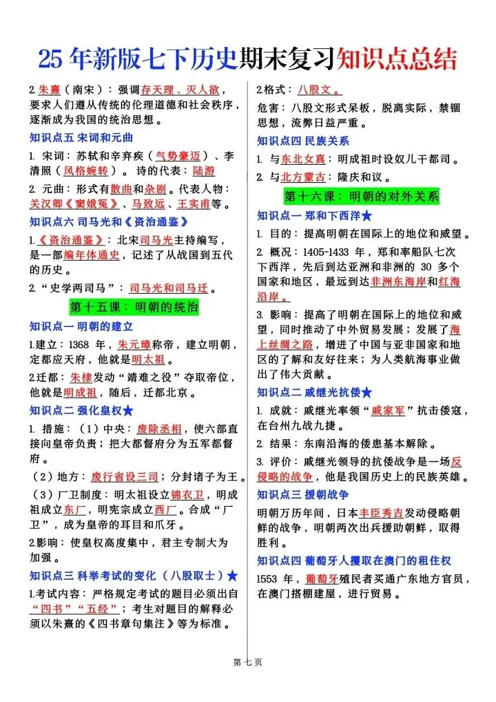 今日分享七年级下册历史期末复习知识点总结(完整电子版可打印)!高清可打印,每日轻量练习,拒绝无效刷题,用系统化资料筑牢学科基础,让假期成为提升的黄金期,开学轻松领跑。