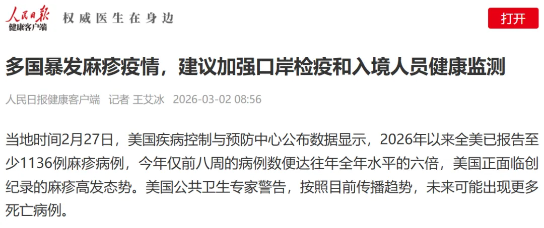 回顾过往,因疫苗谣言导致疫苗犹豫,进而引发传染病局部流行的案例屡见不鲜。而最新的警示是,2026年以来全美已报告至少1136例麻疹病例,今年仅前八周的病例数便达到往年全年水平的六倍[1]。