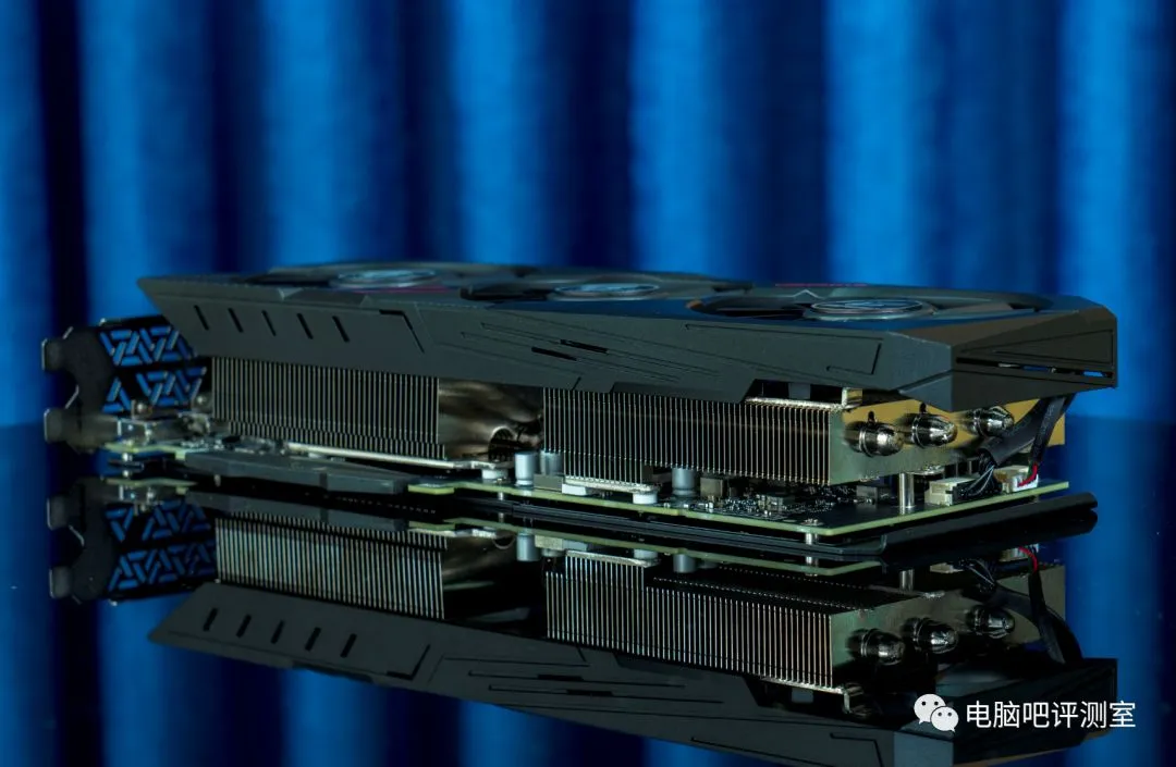 )。显卡采用了3根8mm的镀镁散热铜管(三管齐下),3个9cm风扇,显卡并不是标准的双槽厚度,用了相较厚一些的散热鳍片,所以相比标准双槽他还要更厚实一点。