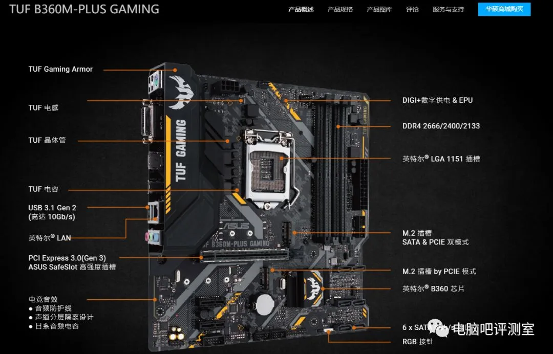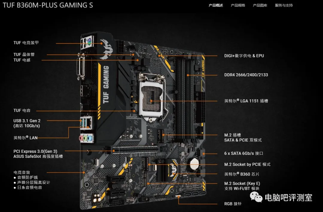 主板用的是华硕的TUF B360M-PLUS GAMING S,S可以理解为SUPER的缩写,作为B360M-PLUS GAMING的升级版,相较于老版本,S版本在供电上做了一些升级,多出两个供电电感。
