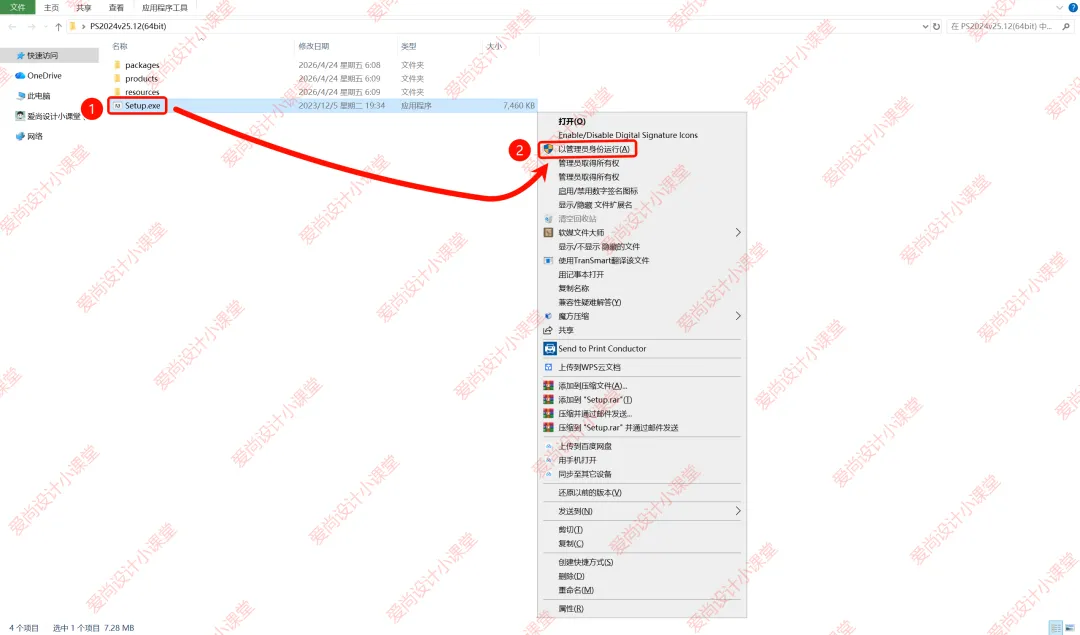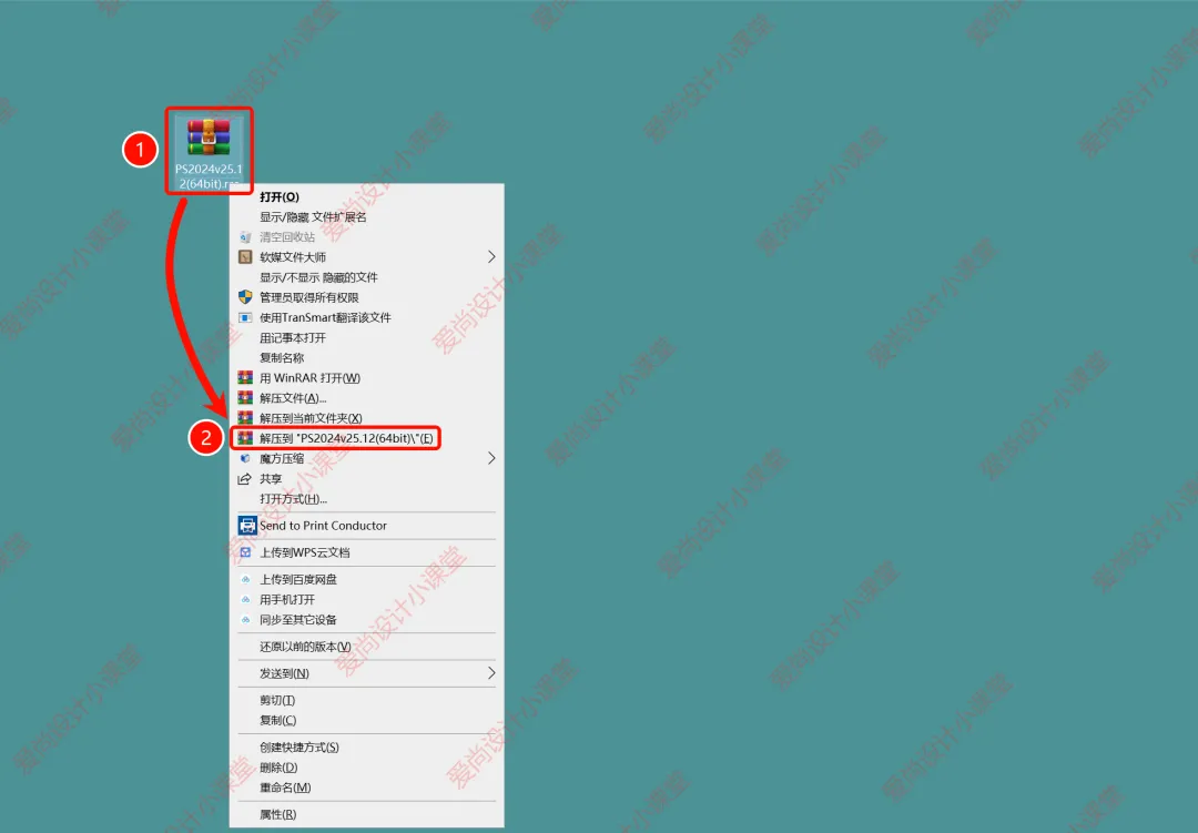 解压安装包:①鼠标右击【PS2024(64bit)】压缩包,选择电脑上安装的解压软件(如:WinRAR)②点击【解压到PS2024(64bit)】。