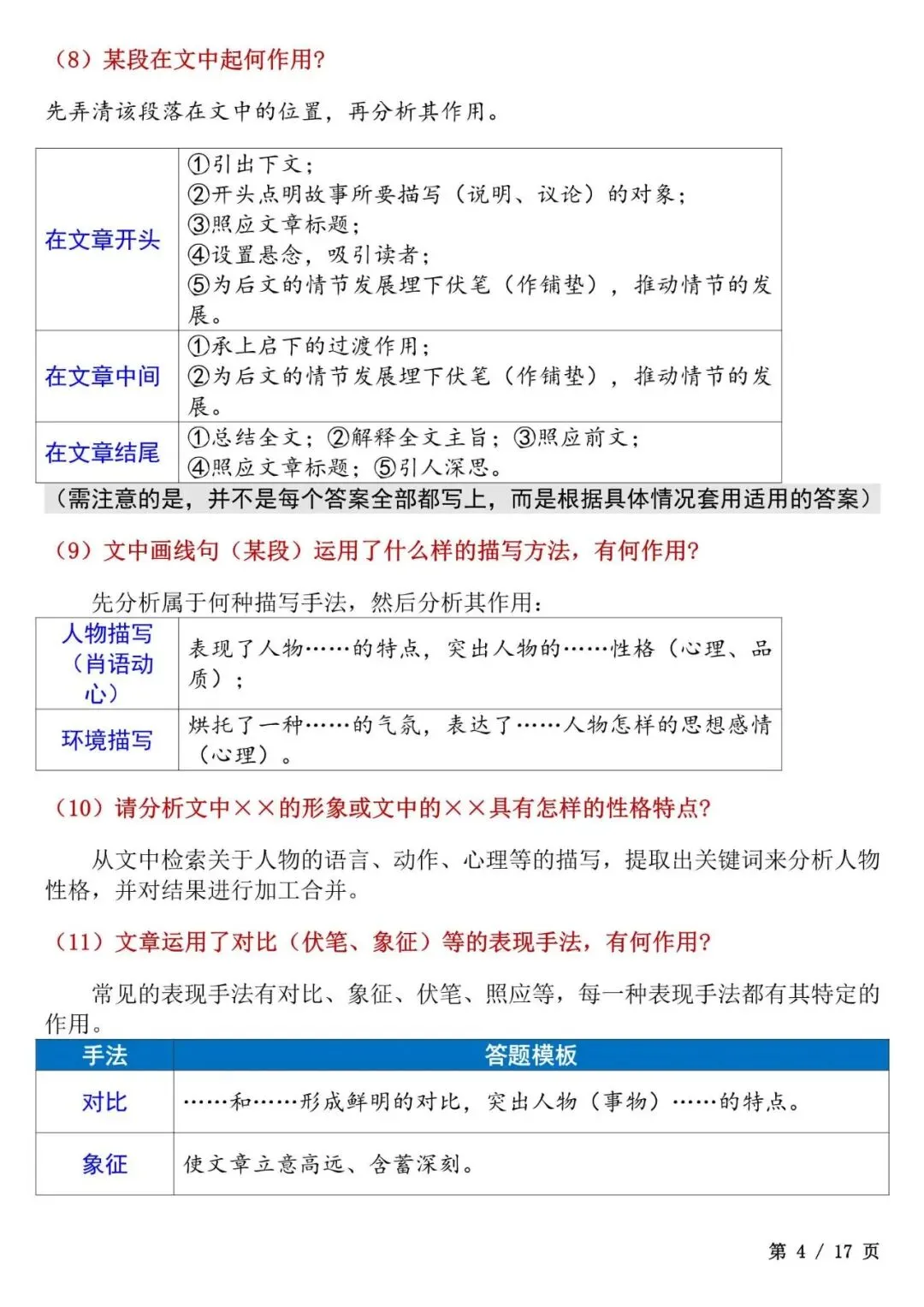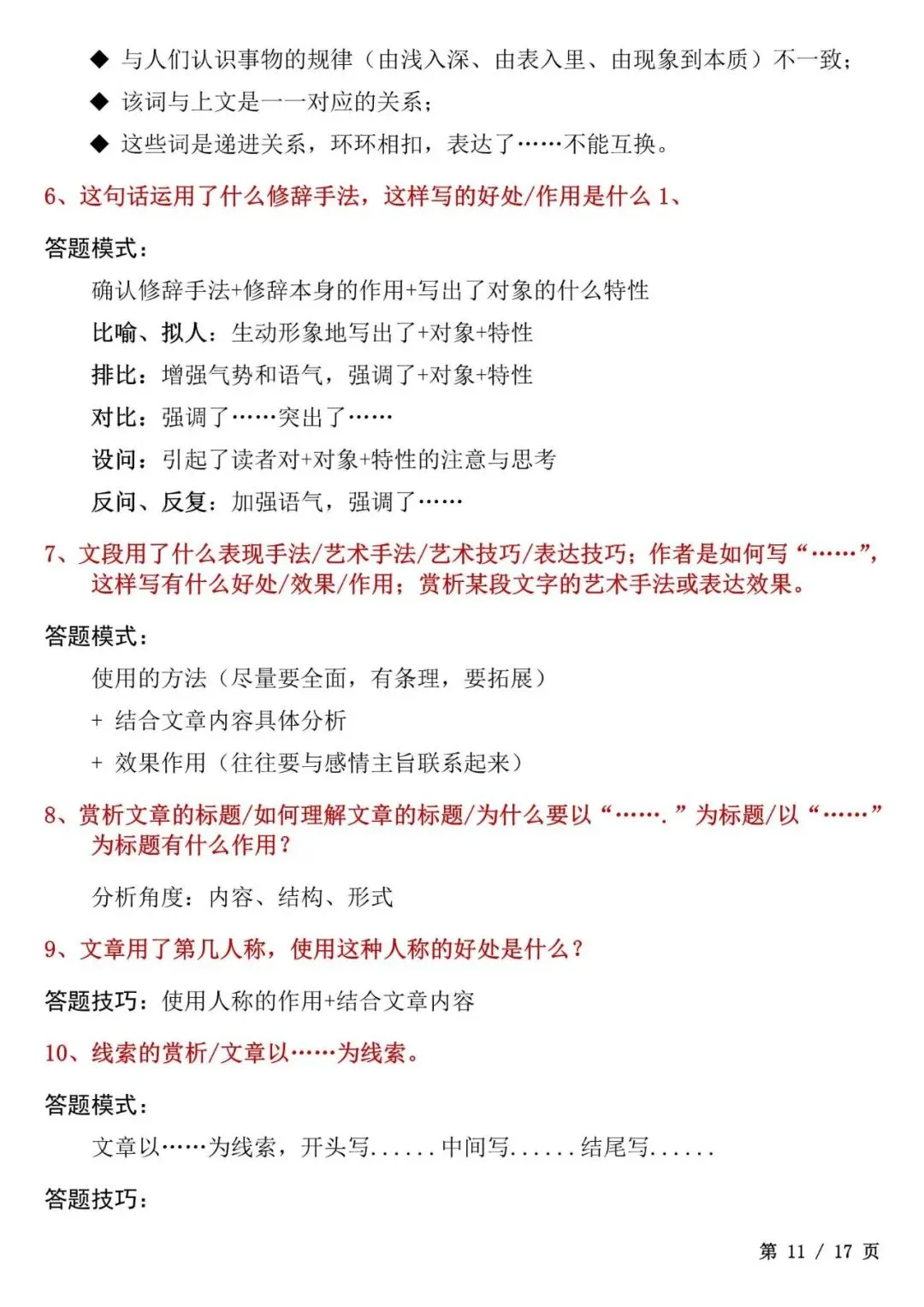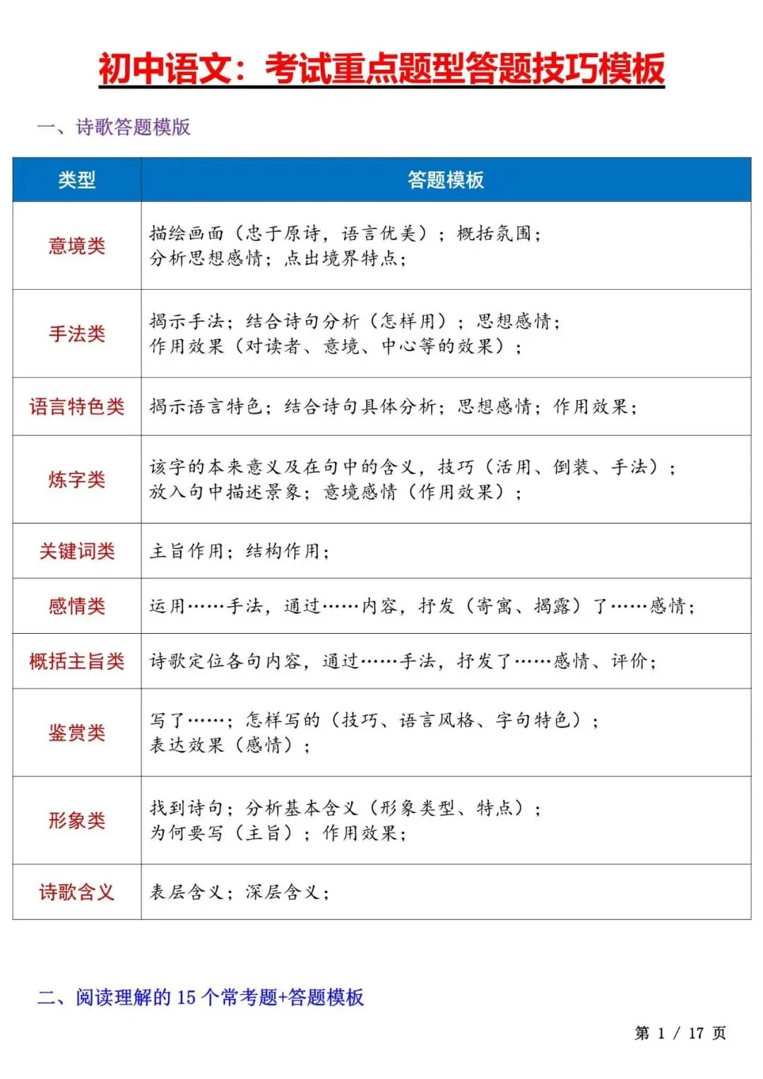 今天老师给大家整理了:初中语文答题模板大全,考试直接套用不丢分,电子版可打印!