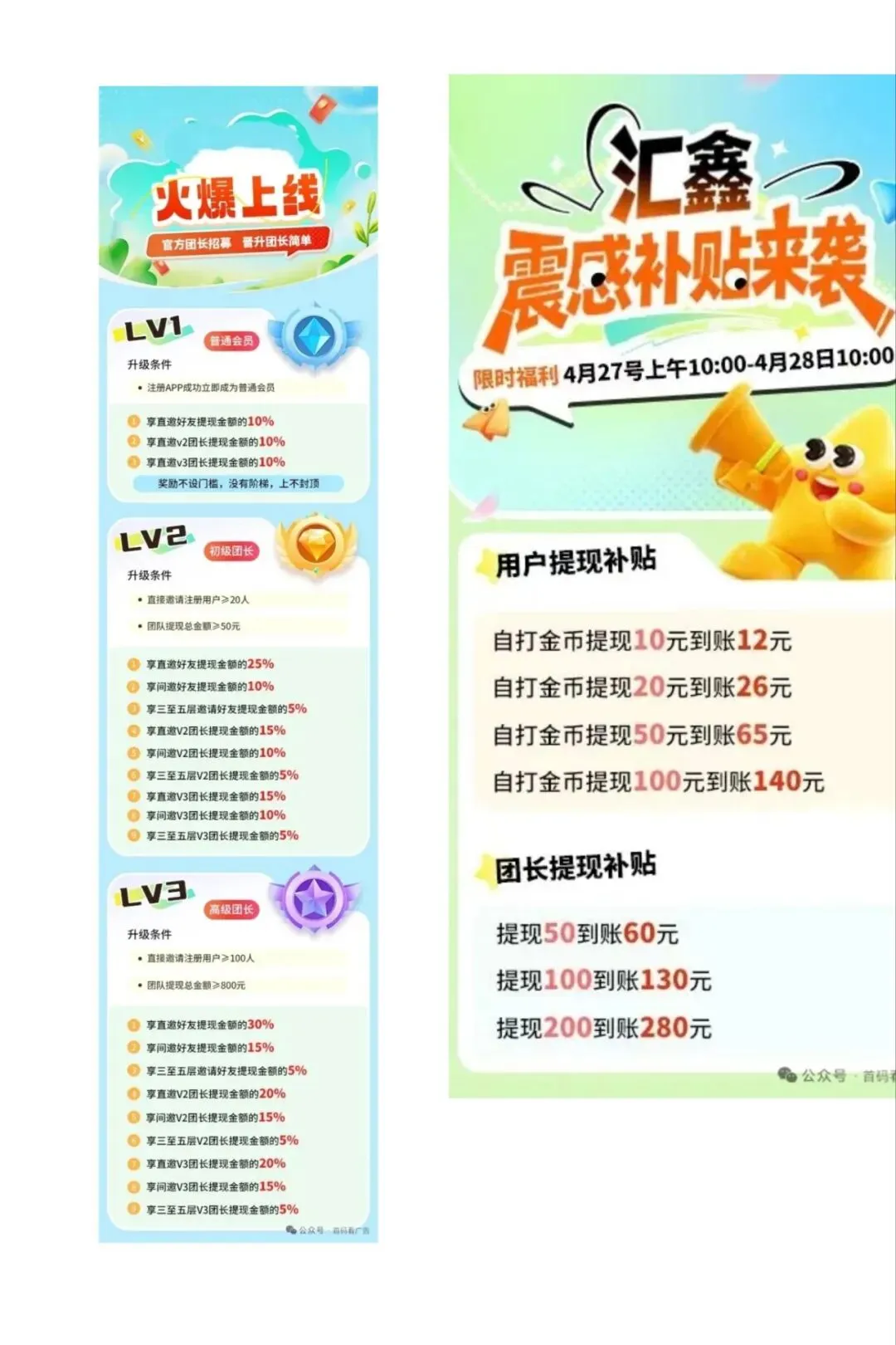 - LV2初级团长:直接邀请注册用户≥20人,团队提现总额≥50元即可升级,可享受更高比例的团队收益分成。