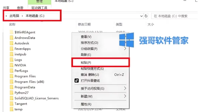 3.打开电脑C盘,鼠标右击空白处选择【粘贴】