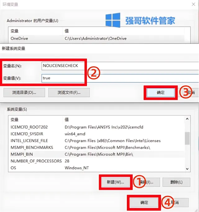 10.创建环境变量:①点击系统变量下的【新建】②输入变量名【NOLICENSECHECK】和变量值【true】③点击【确定】④点击【确定】。