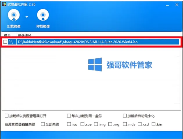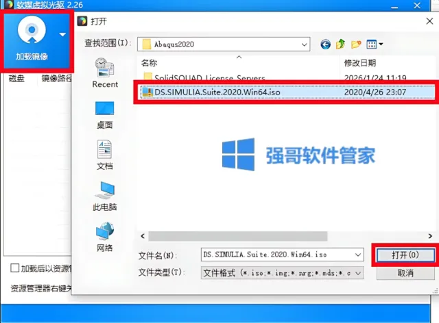 12.点击【加载镜像】选择【DS.SIMULIA.Suite.2020.Win64】,点击【打开】