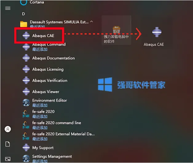 52.创建桌面启动快捷方式:点击桌面左下角【开始】图标,点击【所有应用】→找到并拖动【Abaqus CAE】(位于文件名“Dassault Systemes SIMULIA”下)图标到电脑桌面
