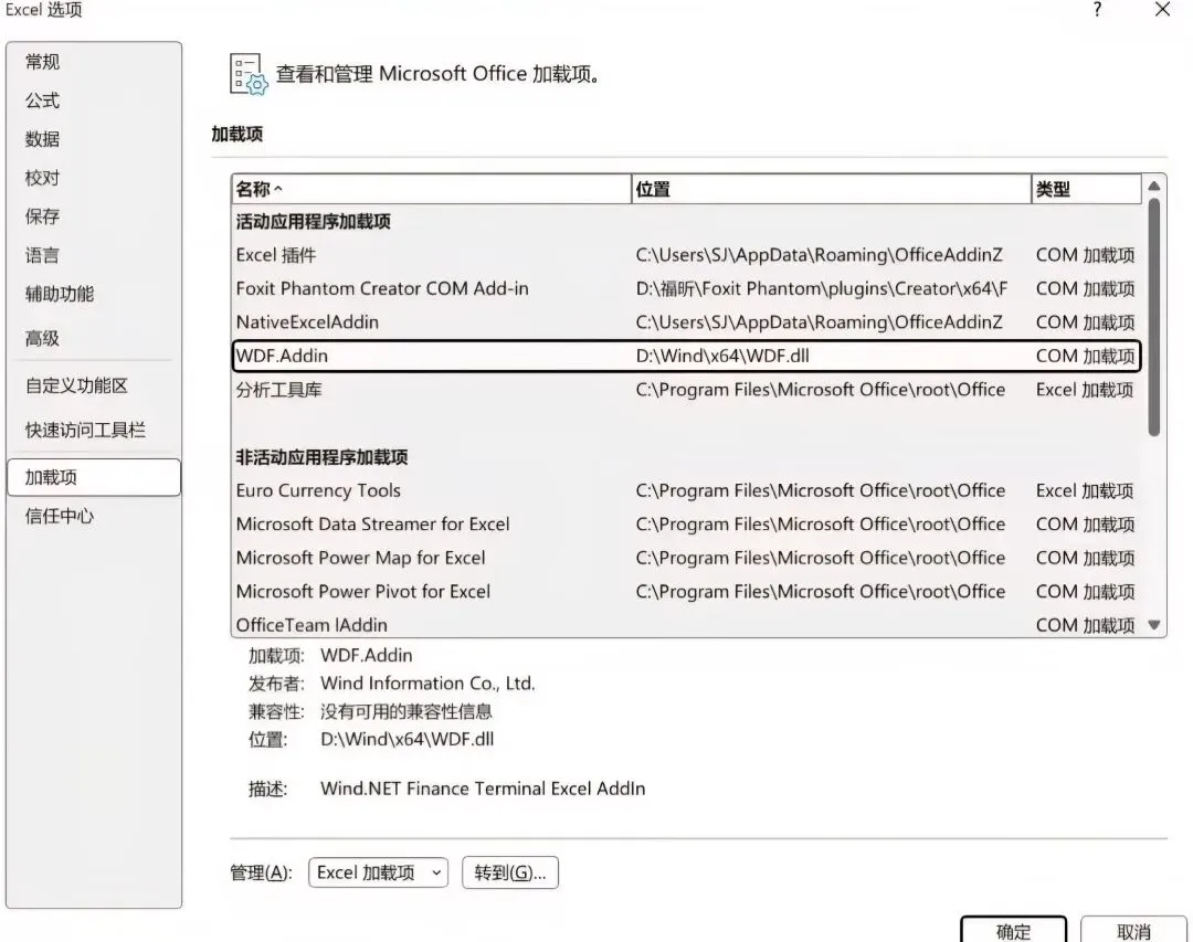 文件→选项→加载项→确保相关加载项已启用(File-Options-Addins)。启用后Wind加载项如图。