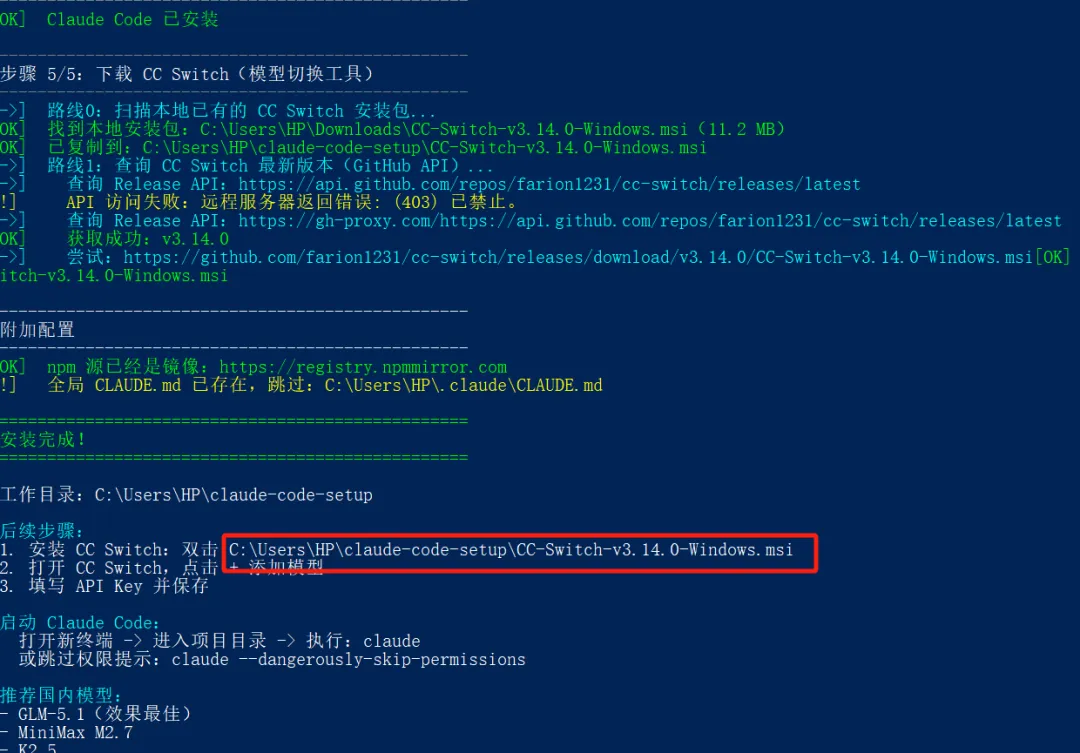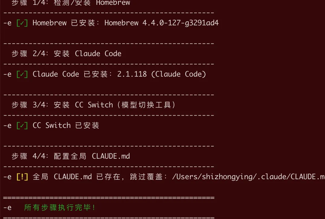 前两天卡兹克大佬发了一篇保姆教程,手把手教大家在国内装上 Claude Code。 Node.js 要装,npm 要配镜像,Claude Code 要安,CC Switch 要下,模型要接, CLAUDE.md 要建... 一套走下来七八个步骤,中间每一步都可能卡住。想了下为啥不写个一键安装脚本,Mac和Windows各一条命令,环境检测、依赖安装、Claude Code 、CC Switch全包了,中间按引导点几下就行,剩下全自动
