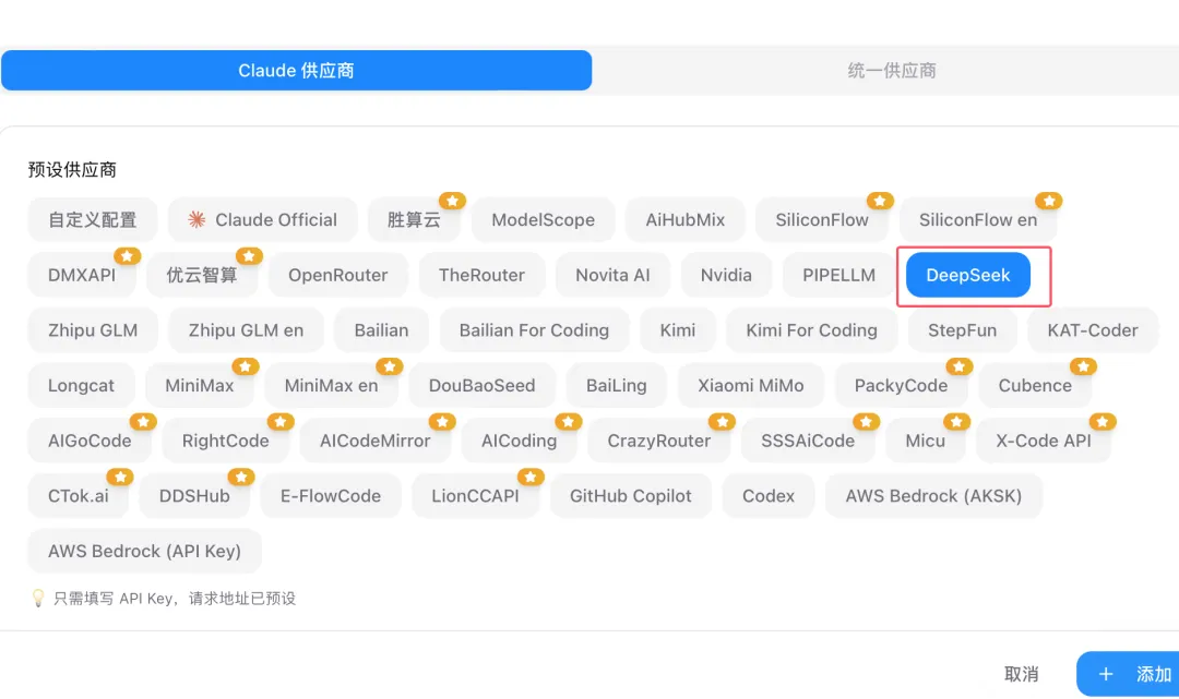 可以打开安装好的cc switch,点击顶部的Claude,添加供应商,可以添加对应的模型。目前claude模型国内用户经常被封的情况下,比较推荐国产deepseek、Zhipu GLM5.1