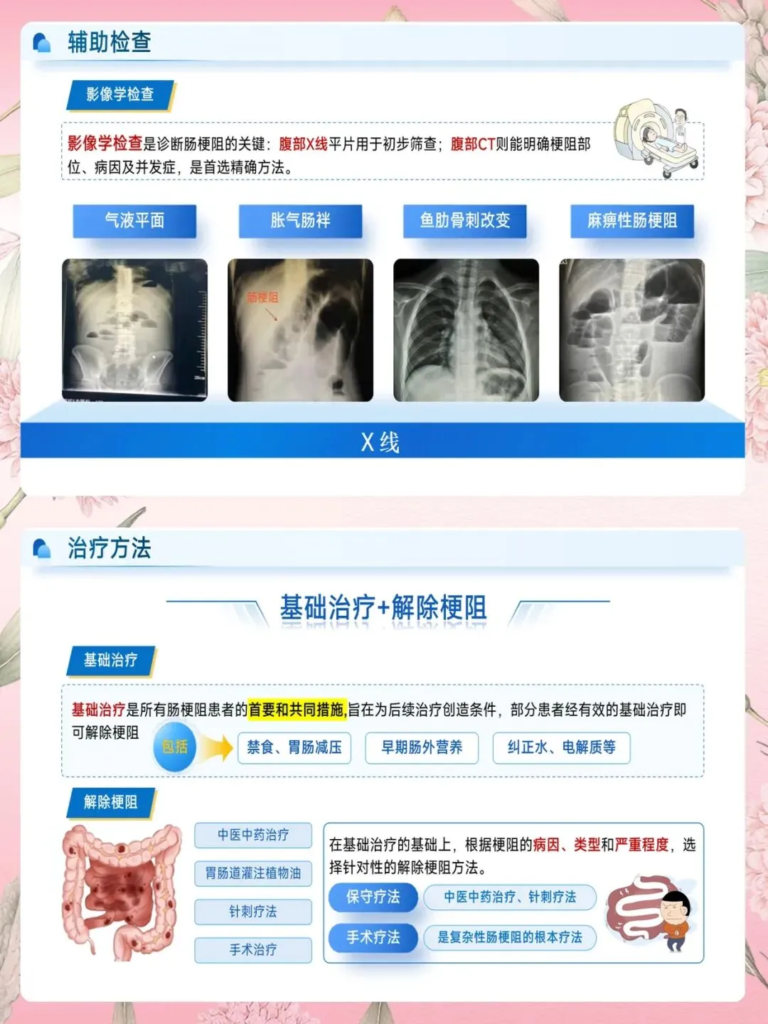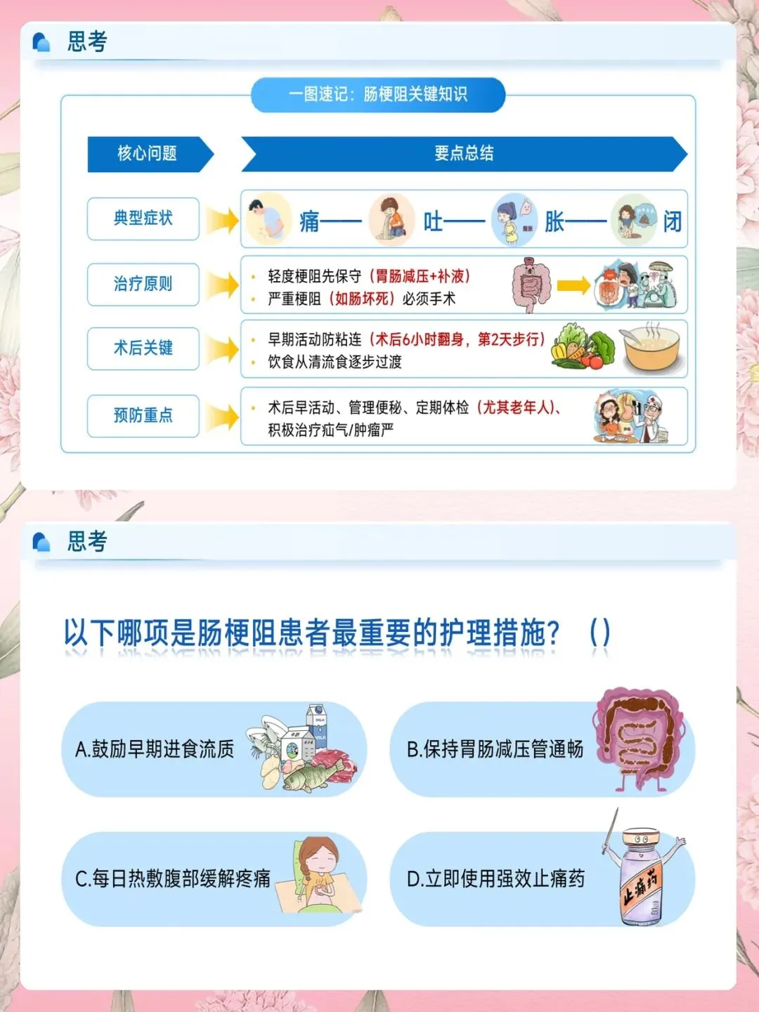 最后提醒大家:轻度梗阻先保守治疗,严重梗阻如肠坏死,必须手术。术后早期活动,6小时翻身,第二天步行,是预防粘连的关键。